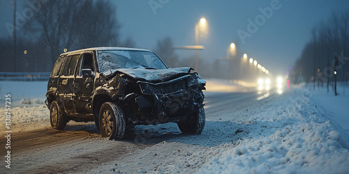 © Ірина Пальцева, Obraz premium Black car damaged on a snowy road amid light snowfall, surrounded by a serene winter landscape and distant headlights.