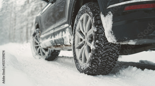 Fototapeta premium Black car winter tires on snow covered road provide safe traction and control, enhancing vehicle stability during icy and snowy conditions in cold weather driving environment.