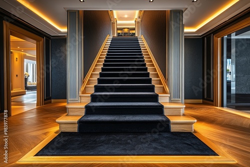 © Anatoll Paveel, Obraz premium Black carpet steps and narrow hallway of luxury home with wooden floor.