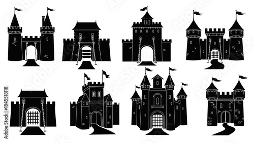 Obraz premium Black castle silhouettes set against white background for architectural design