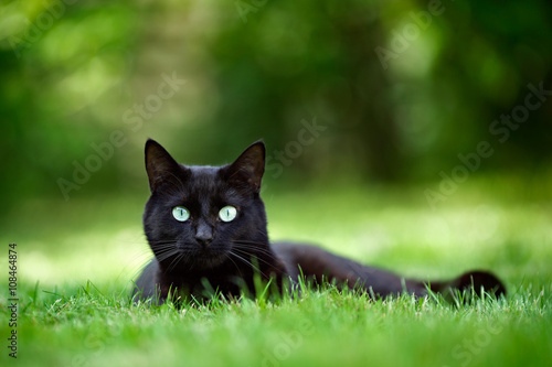 © IG Digital Arts, Obraz premium Black cat lying in grass in the garden and looking directly at the camera.