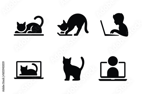Obraz premium Black cat silhouettes interacting with technology and a person using a laptop vector