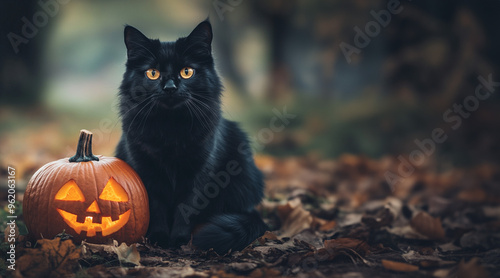 Naklejka premium Black cat sitting next to a jack o lantern outdoors with autumn leaves and room for text
