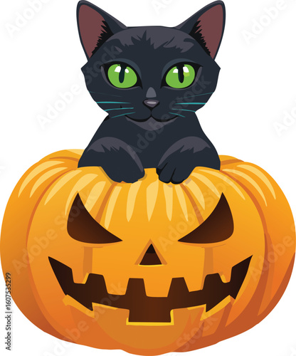 © Earthen Stock, Fototapeta premium Black cat sitting on a carved pumpkin, Halloween