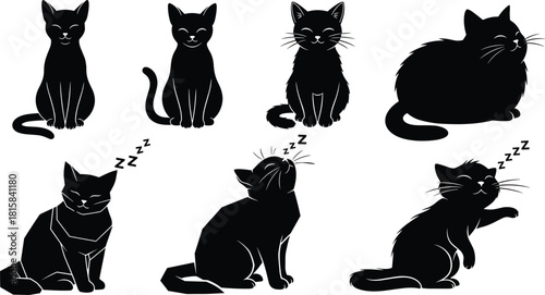 © Shariyar Pantho, Naklejka premium Black cat vector silhouette collection, cute feline mascot sitting and sleeping in various poses, adorable pet animal icon set design elements.