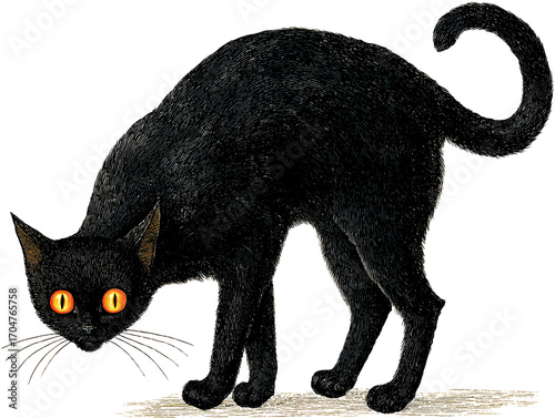 © Creakin, Obraz premium Black cat with arched back and glowing eyes, illustration, full body view, white background.