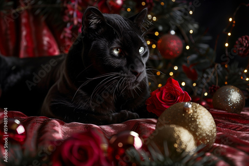 © Photo Fairy, Obraz premium Black Cat with Christmas Decorations