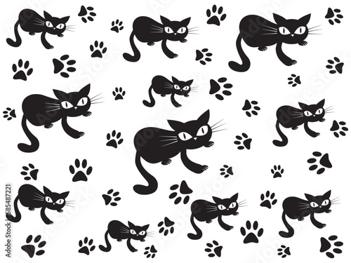 © Grego HQ, Naklejka premium black cats texture with footprints, black and white, vector illustration, art.