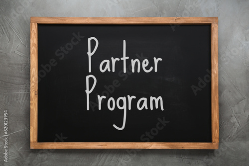Obraz premium Black chalkboard with words Partner Program on grey wall