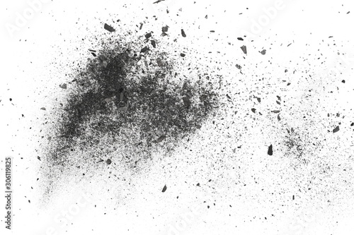 Fototapeta premium Black charcoal dust explosion, gunpowder isolated on white background and...