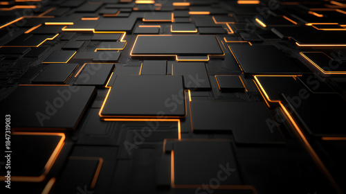 Obraz premium Black circuit board with glowing orange edge lines, futuristic electronic grid, sleek modern