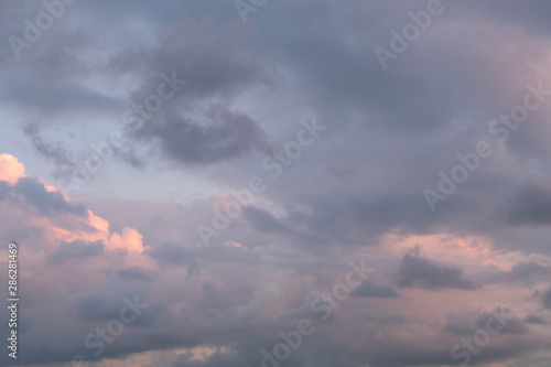 Fototapeta premium Black clouds coming from top to mixed black and white cloud cover. Sunset light. Background.