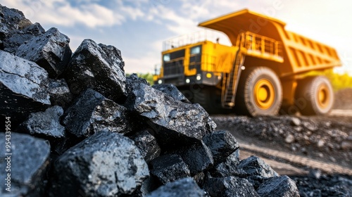 © BOJOShop, Obraz premium Black Coal Rocks in Front of Large Yellow Mining Truck