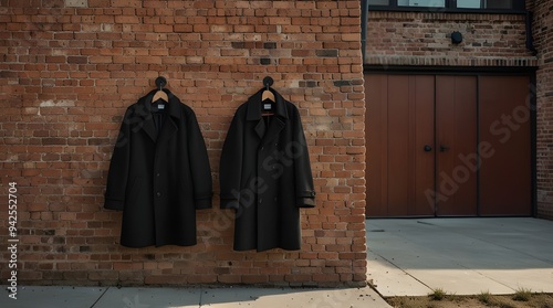 © Neelam, Naklejka premium Black Coats Hanging on a Rustic Brick Wall.generative.ai