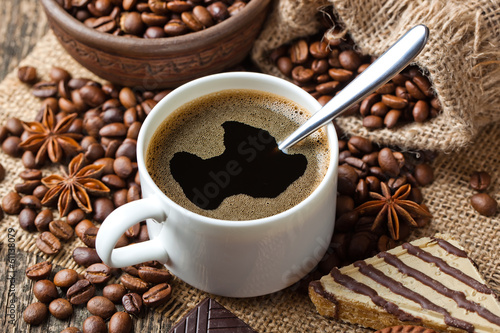 © vizafoto, Fototapeta premium Black coffee, a cup of beans