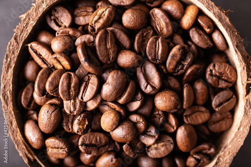© mira_y, Naklejka premium black coffee beans arabica, aromatic in a coconut bowl, close-up