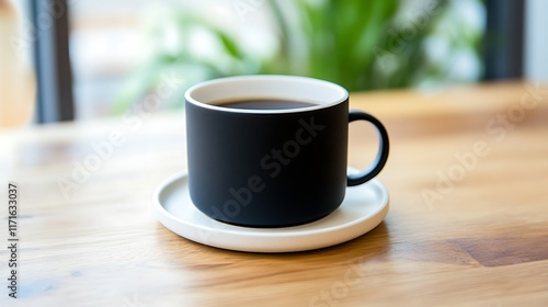 Obraz premium Black Coffee Mug On White Coaster Wooden Table