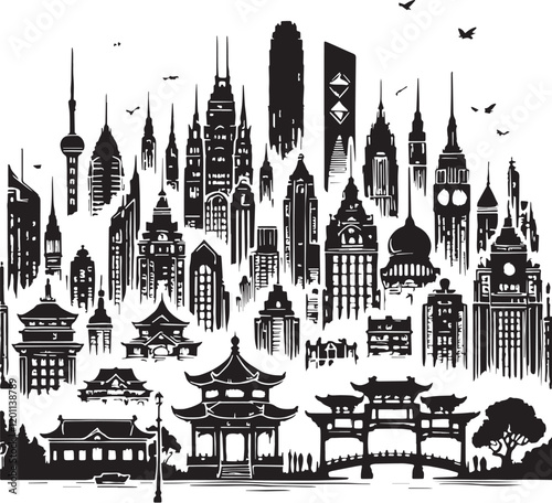 © graphic, Fototapeta premium Black Color City Silhouette Vector Illustration, Solid White Background