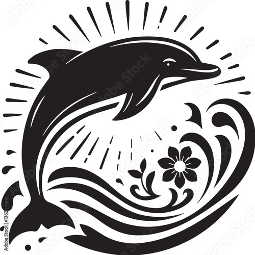 © graphic, Naklejka premium Black Color Dolphin Silhouette Vector Illustration, Solid White Background