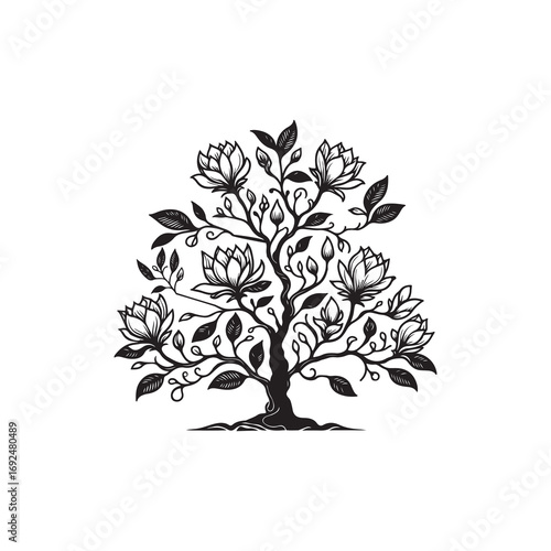 © Faysal, Obraz premium Black Color Magnolia Tree Silhouette Vector Illustration, Solid White Background.