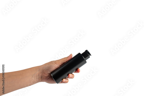 © apinya, Fototapeta premium Black cosmetic flip top bottle in hand isolated on transparent background.