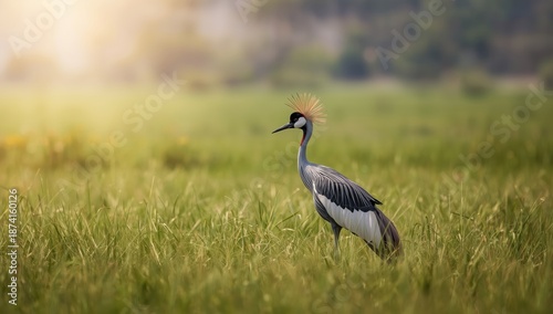 © NFTNexus, Fototapeta premium Black crested crane perched among summer grass, emphasizing avian habitat preservation, World Migratory Bird Day