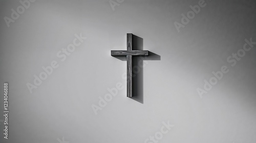 © Roman Stock studio, Naklejka premium Black cross on gray wall with soft shadow and minimalistic lighting.