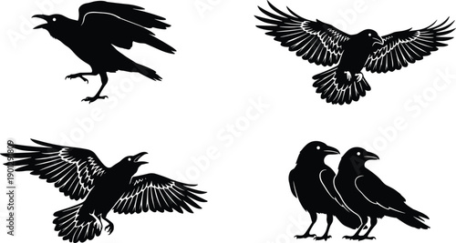 Fototapeta premium Black Crow and Raven Silhouettes Set Featuring Flying Birds Pair of Ravens...