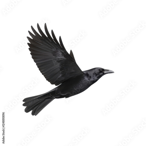 Naklejka premium Black crow in flight, with wings spread, white isolated background