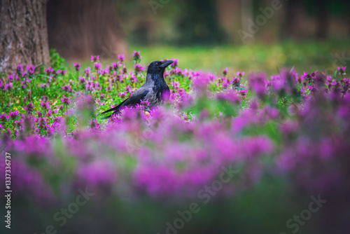© ValentinValkov, Obraz premium Black crow jackdaw raven on the grass with purple flowers in the city park