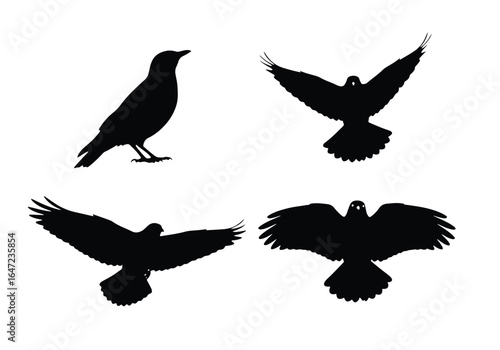 © Richard, Fototapeta premium Black crow or raven silhouettes in various flying and perched poses, isolated on a white background