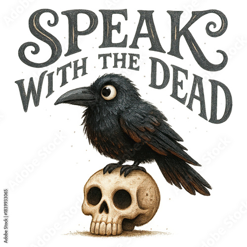 © Tati, Obraz premium Black crow perched on a human skull beneath hand-lettered "Speak with the Dead" text, gothic vintage tattoo-style illustration with macabre, spooky vibe