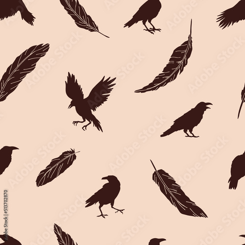 © AngellozOlga, Obraz premium Black Crow silhouette in various poses bird feather vector seamless pattern. Line art retro raven figures background. Boho Halloween mystical surface design.