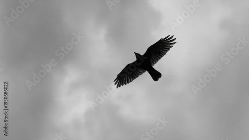 © Vibu design gallery, Fototapeta premium Black Crow Soaring in Overcast Grey Sky