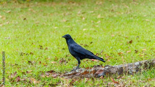 © Kazutaka, Fototapeta premium Black crow standing on green grass field