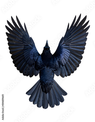 © Thak Pixel, Fototapeta premium Black crow with wings spread wide in flight, dramatic rear view bird silhouette style on isolated background