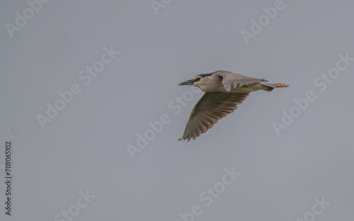 Obraz premium Black-crowned Night Heron in flight over delta ebro river