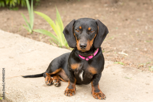 Fototapeta premium Black dachshund sitting and looking to camera