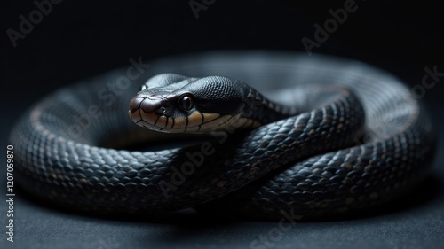 © axalaimaxala, Obraz premium black dangerous snake looking at camera on dark background