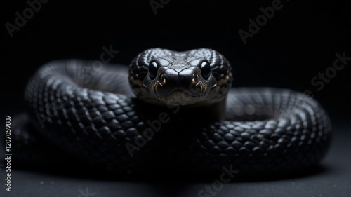 © axalaimaxala, Naklejka premium black dangerous snake looking at camera on dark background
