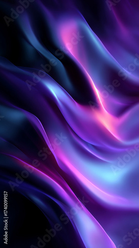 © YoursTrulyPhotos, Obraz premium Black dark abstract background with flowing iridescent blue and purple neon liquid waves symbolizing energy motion and futurism representing a luminous holographic gradient with smooth dynamic glow