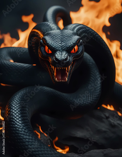 © Black Morion, Obraz premium Black demonic snake against a background of fire