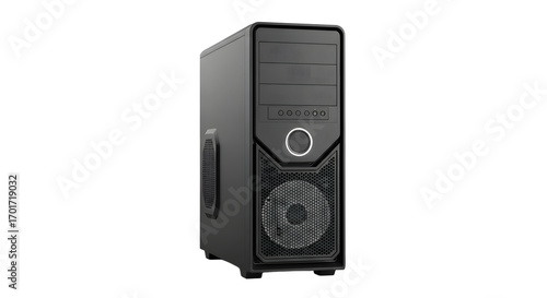 © Popilo, Obraz premium Black Desktop Computer Tower with Front Panel Display and Large Speaker Mesh