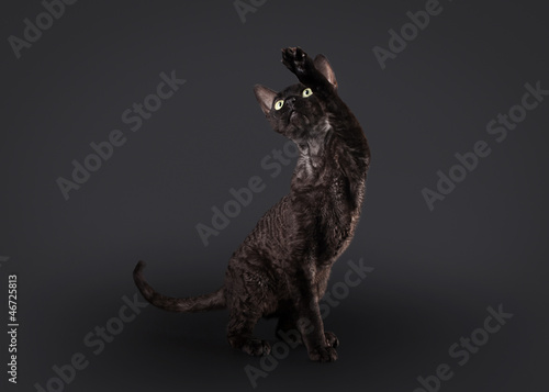 Obraz premium black devon rex cat on black background