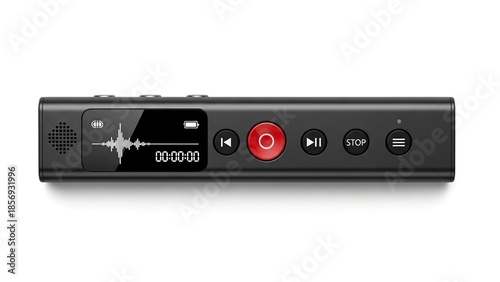 © HabiburRahman, Fototapeta premium Black digital voice recorder with red button isolated on white background
