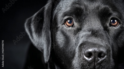 Fototapeta premium Black dog portrait showcasing calm expression in a dimly lit setting,...