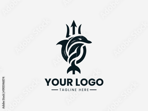 © Ani, Fototapeta premium Black dolphin logo with trident on white background with space for custom text