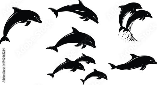 Fototapeta premium Black dolphin silhouette illustrations, marine animal vector design, ocean wildlife jumping, swimming group artwork, sea life graphic art, aquatic mammal drawing