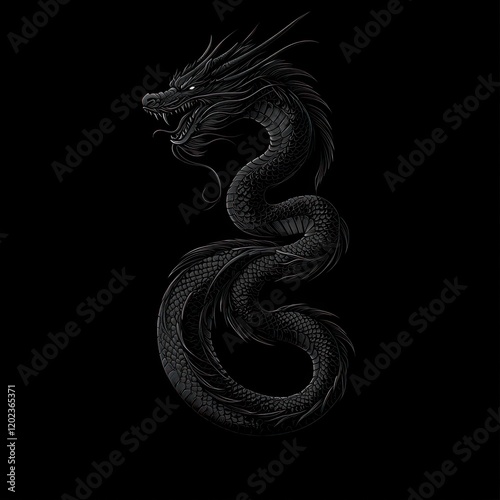 Fototapeta premium Black dragon coiled, dark background, mythical creature, fantasy art, design element