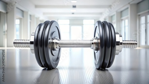Naklejka premium Black dumbbell is lying on the floor in a gym with a lot of natural light...
